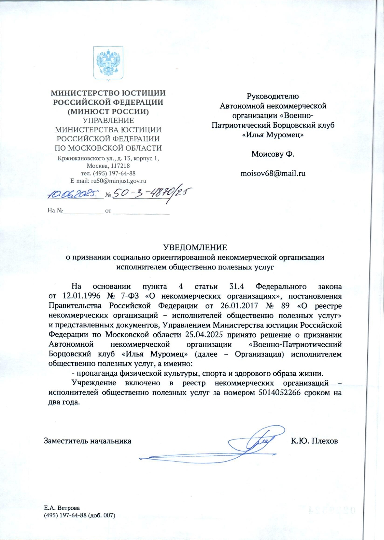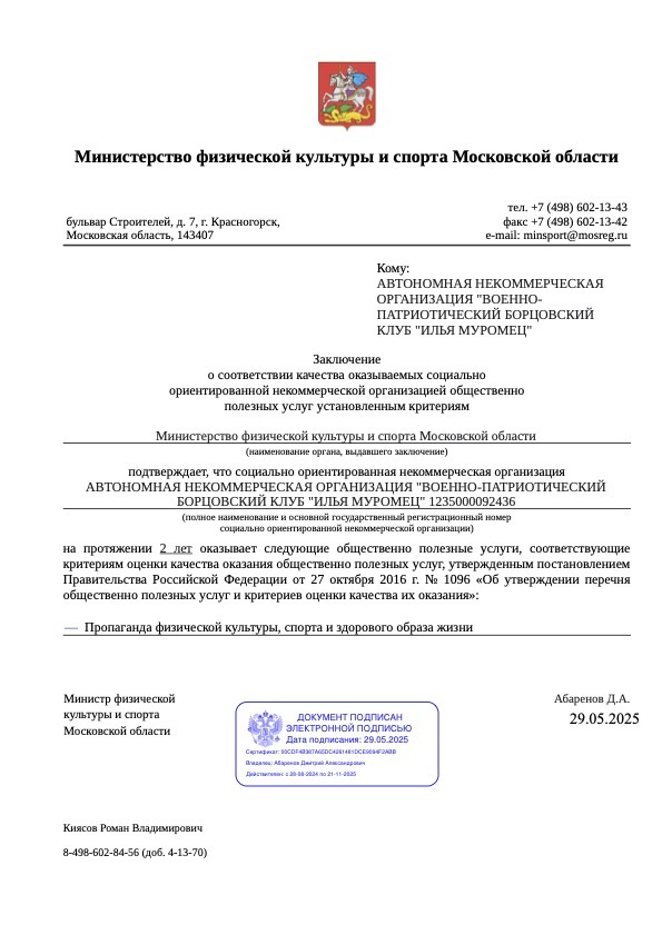 Управлением Министерства юстиции Российской Федерации по Московской области 25.04.2025 принято решение о признании АНО "ВПБК Илья Муромец" исполнителем общественно полезных услуг, а именно: